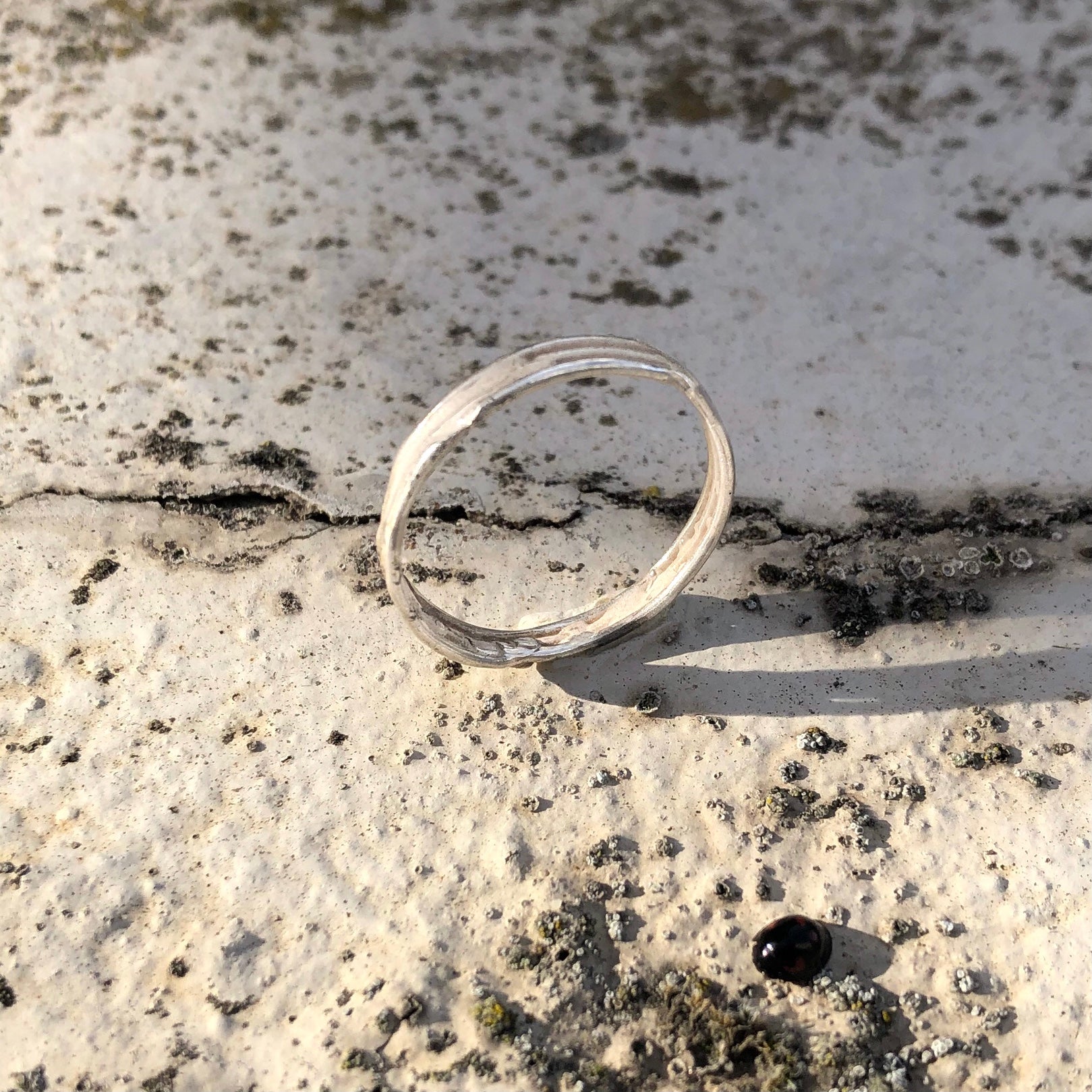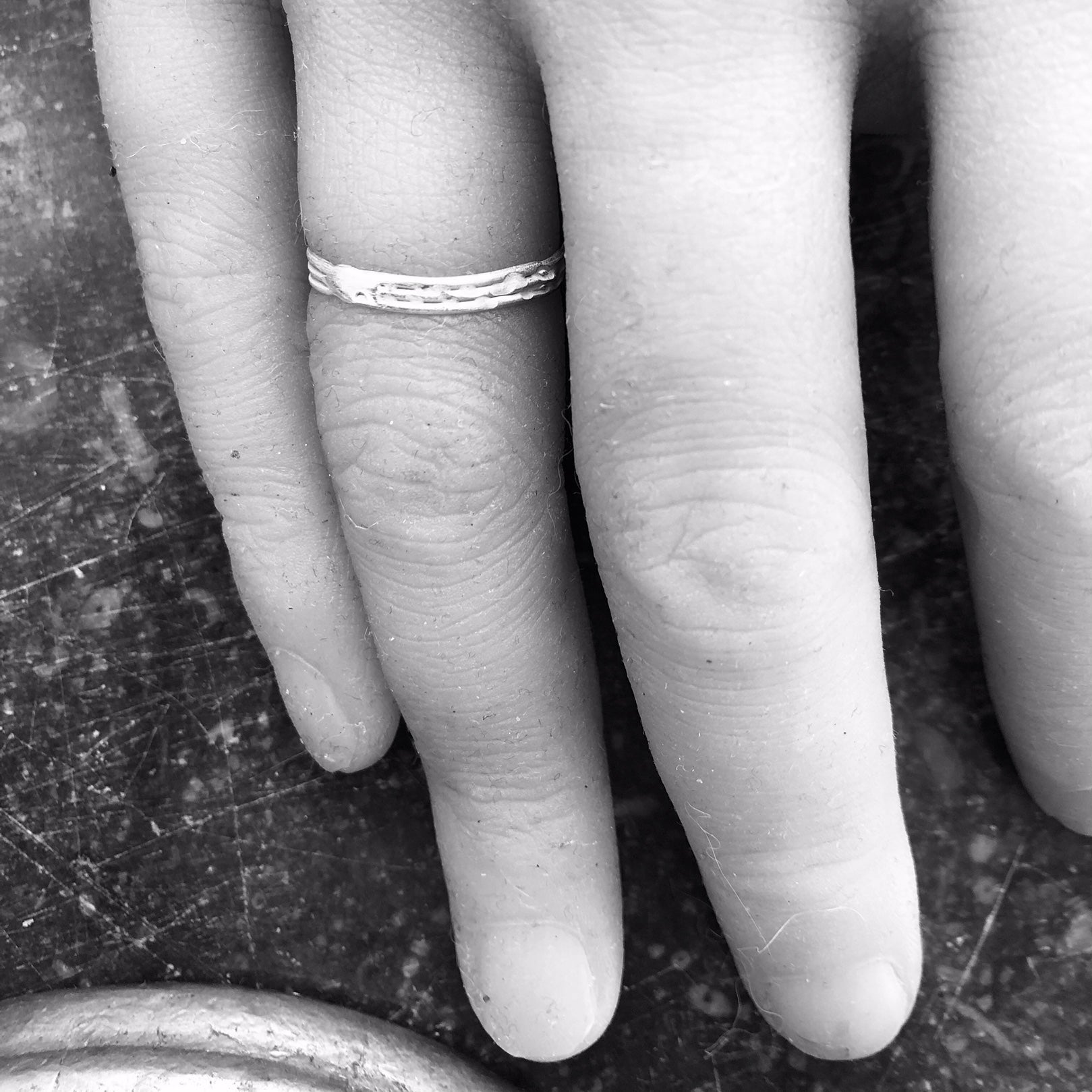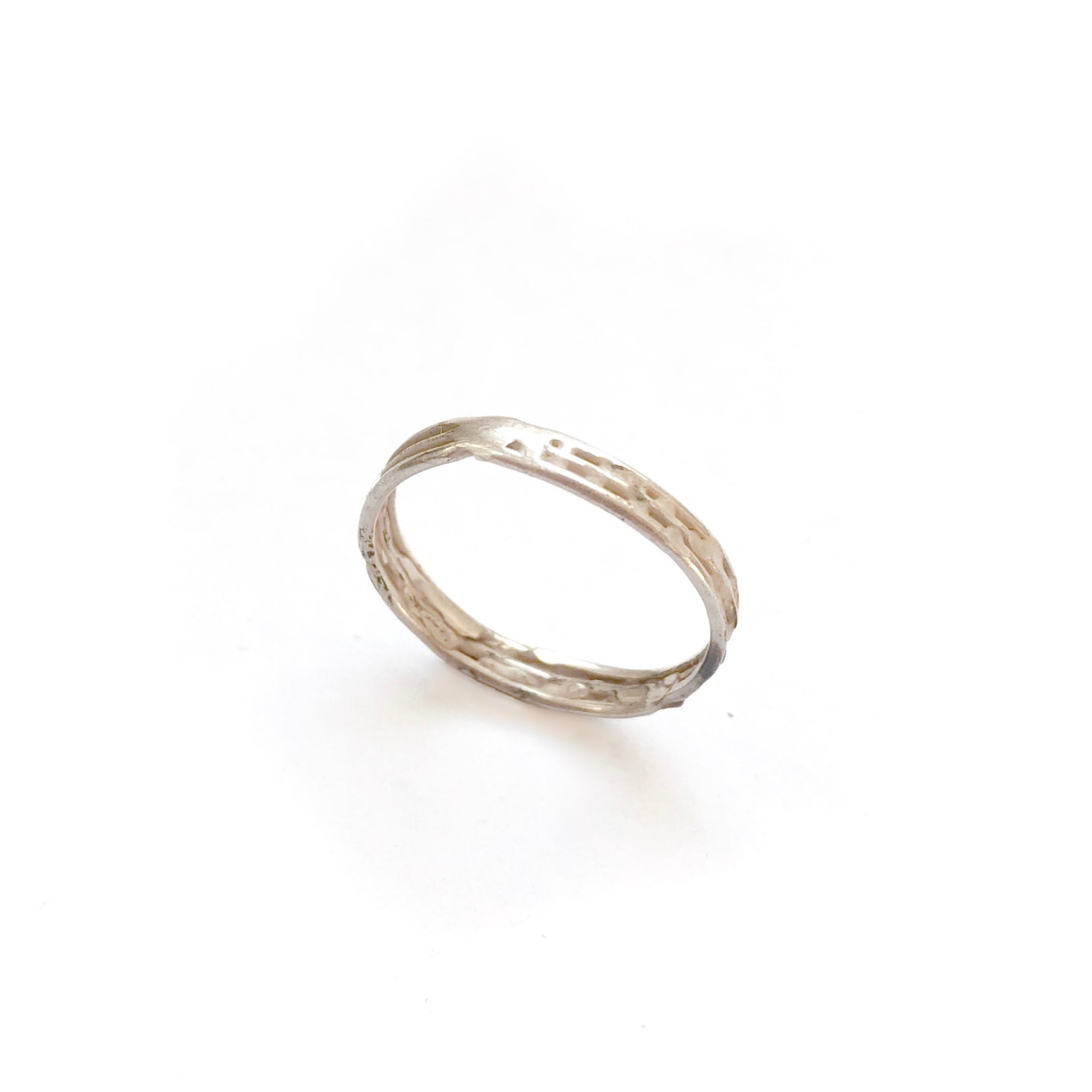 Drei feine Drähte, die sich suchen, finden und wieder verlieren. Dieser zarte Ring ist mehr als die Summe seiner Teile; er ist ein Abbild der menschlichen Erfahrung. Er wirkt organisch, fast so, als wäre er über die Zeit gewachsen. Stellenweise sind die Linien untrennbar miteinander verschmolzen, als Zeichen für jene Momente, die uns prägen. Er ist ein Begleiter für dich, wenn du den Sinn im Unvollendeten suchst.