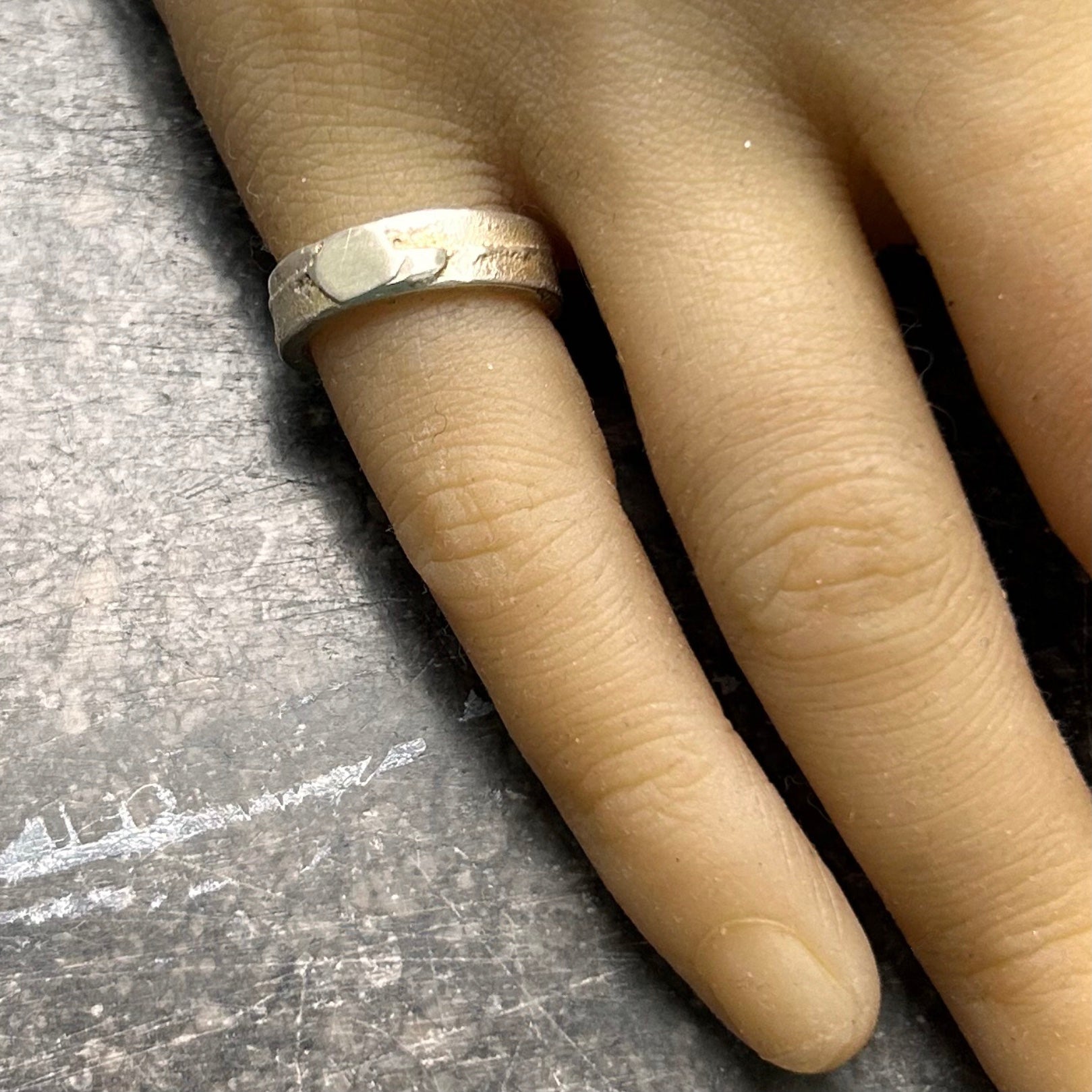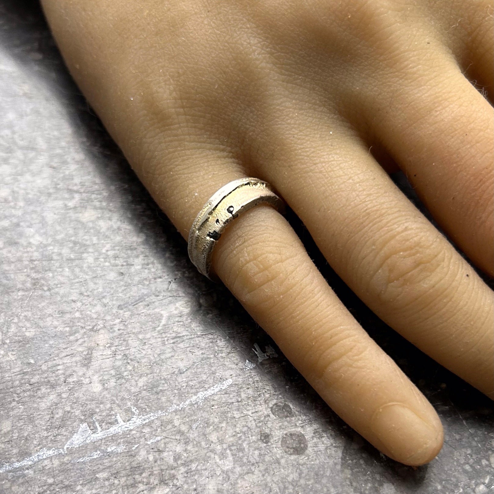 Dieser breite Ring trägt die Sprache der Erde an deiner Hand. Seine Oberfläche ist nicht glattpoliert, sondern erinnert an archaische Steinstrukturen – ein Fragment Gebirge, das die Zeit überdauert hat. Die sanfte, goldene Patina liegt wie ein spätes Abendlicht auf dem Silber, während an den Kanten das reine Metall hervorblitzt, als hätte die Brandung des Alltags es freigespült. Ein Objekt für dich, wenn du Präsenz nicht durch Lautstärke, sondern durch Beständigkeit definierst.